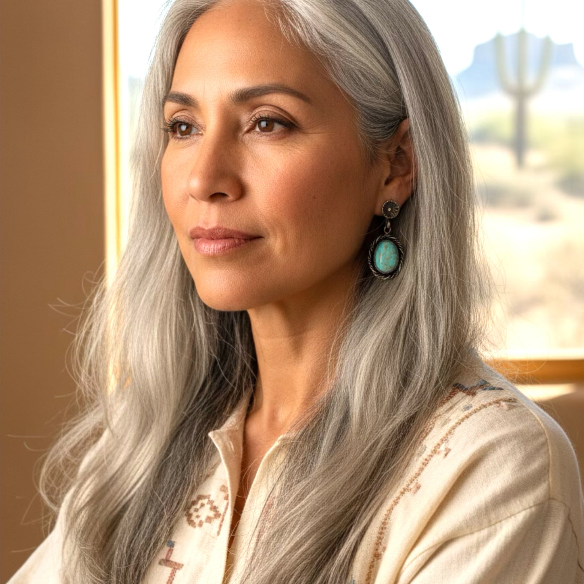 Beautiful natural and RARE old AAA Grade #8 Mine turquoise set in our sterling silver bezels stamped design earrings, 1.75" long including domed earwires. One of a kind handcrafted earring pair. Stone size 19x16mm.