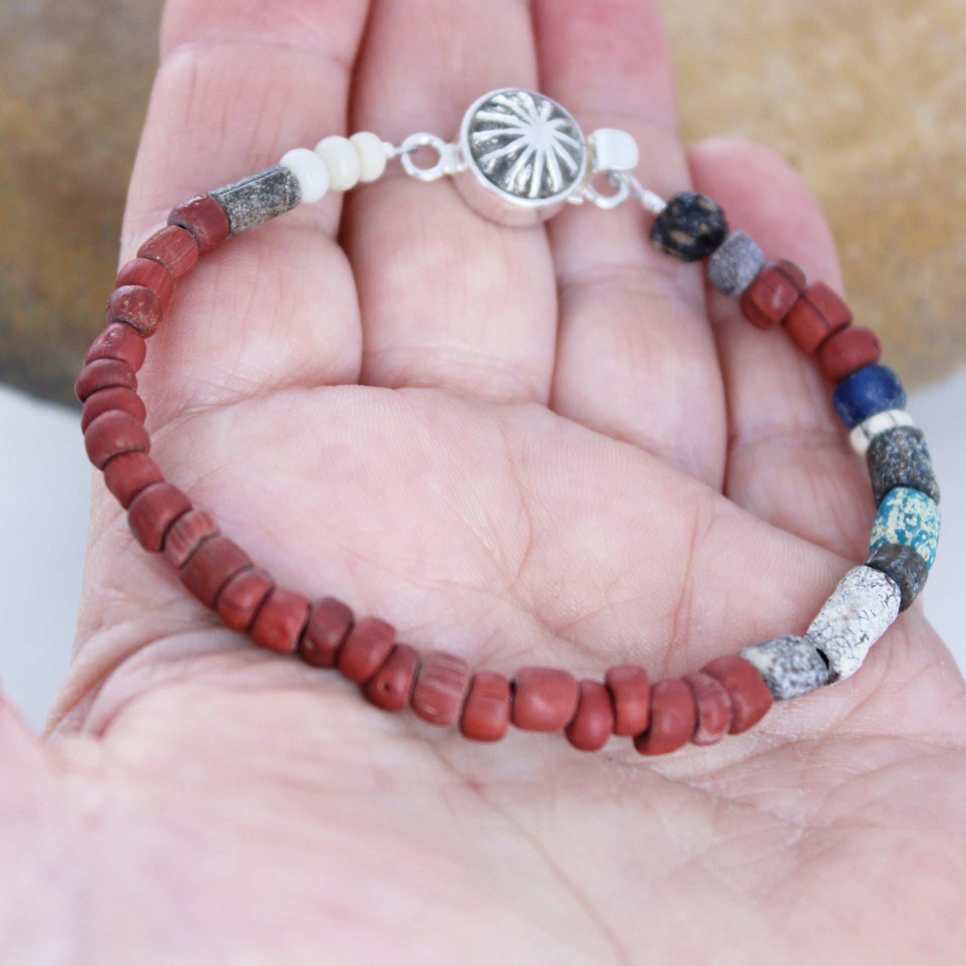 These beautiful ancient Roman Glass beads were discovered in Northeast Afghanistan, an area that was once part of the Bactrian Kingdom. Each bead is unique and exquisitely detailed, set in a bracelet of our own design. The bracelet is finished with our handmade sterling silver Concho style clasp. It fits wrists measuring 7" to 7.25" and has an overall length of 7.35" when clasped.