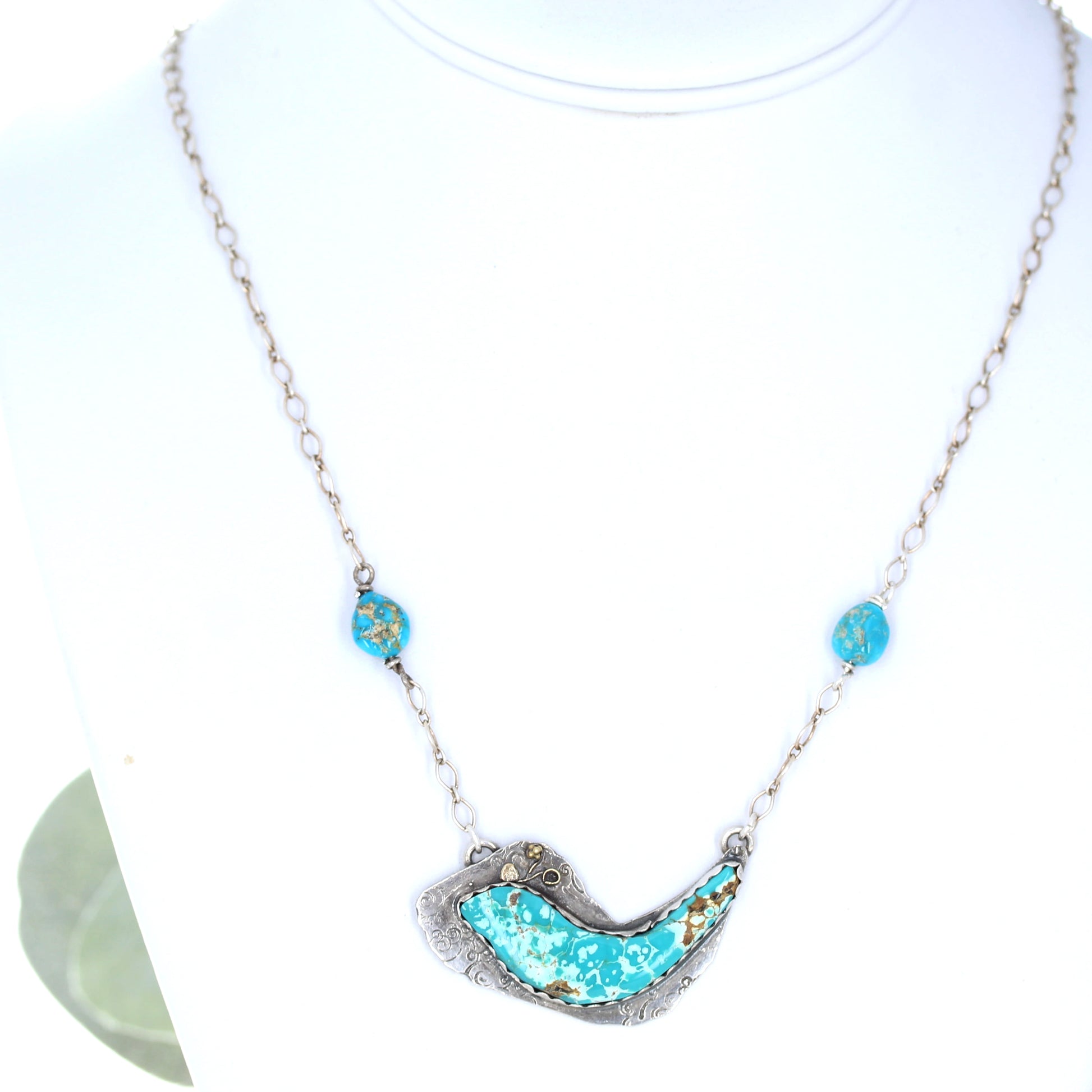 Gorgeous natural Blue Moon Turquoise cabochon carved into an elegant bird and set in .925 sterling silver with 18K Gold accents! Overall this pendant measures 2". Our own pendant design, inspired by our New Mexico surroundings, handcrafted in our studio! One of a kind! 18"/adjustable shorter.