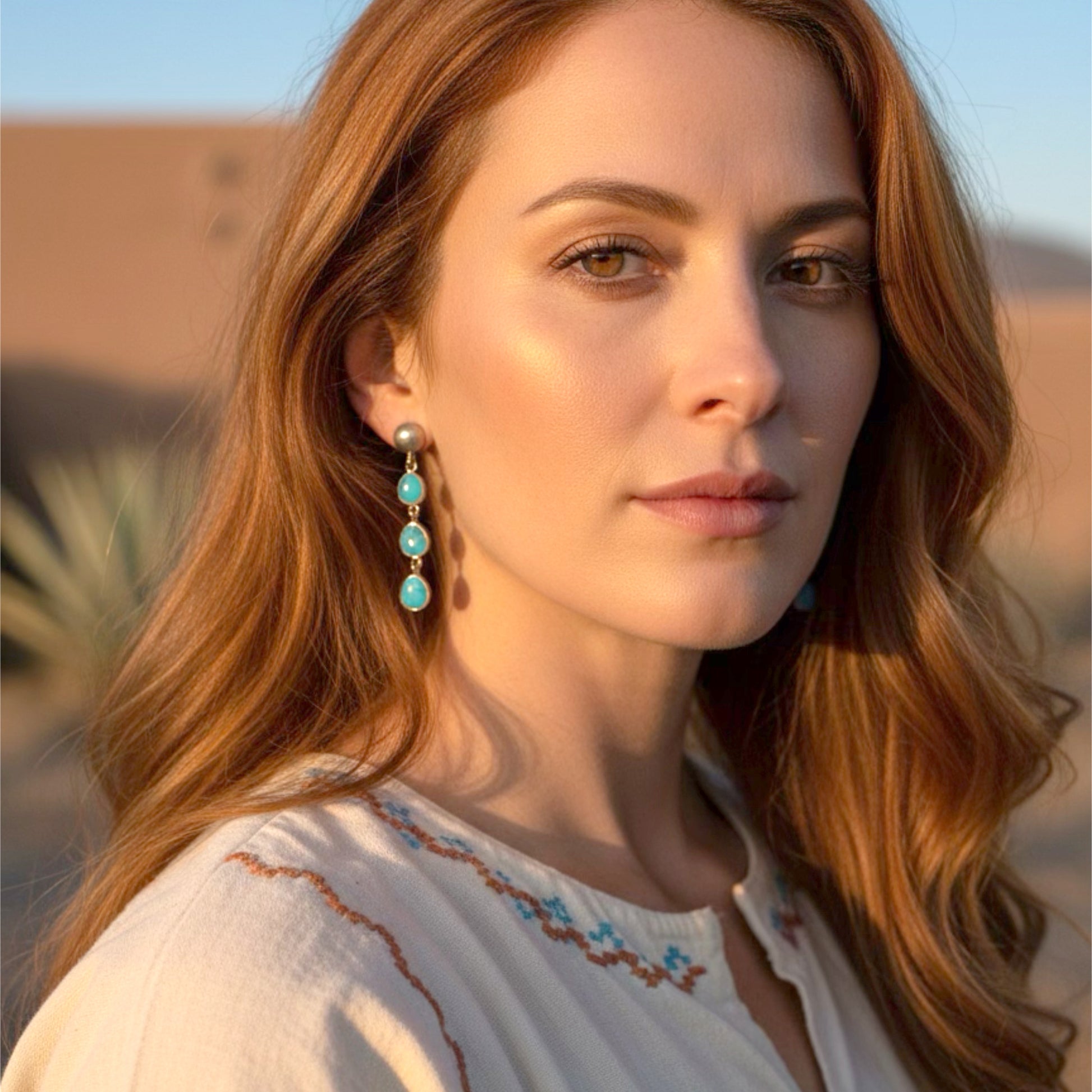 Long dangling 3 stone Blue Bird Turquoise and sterling silver earrings. Fresh natural color, sky blue. 2". Stone size 10-11mm.