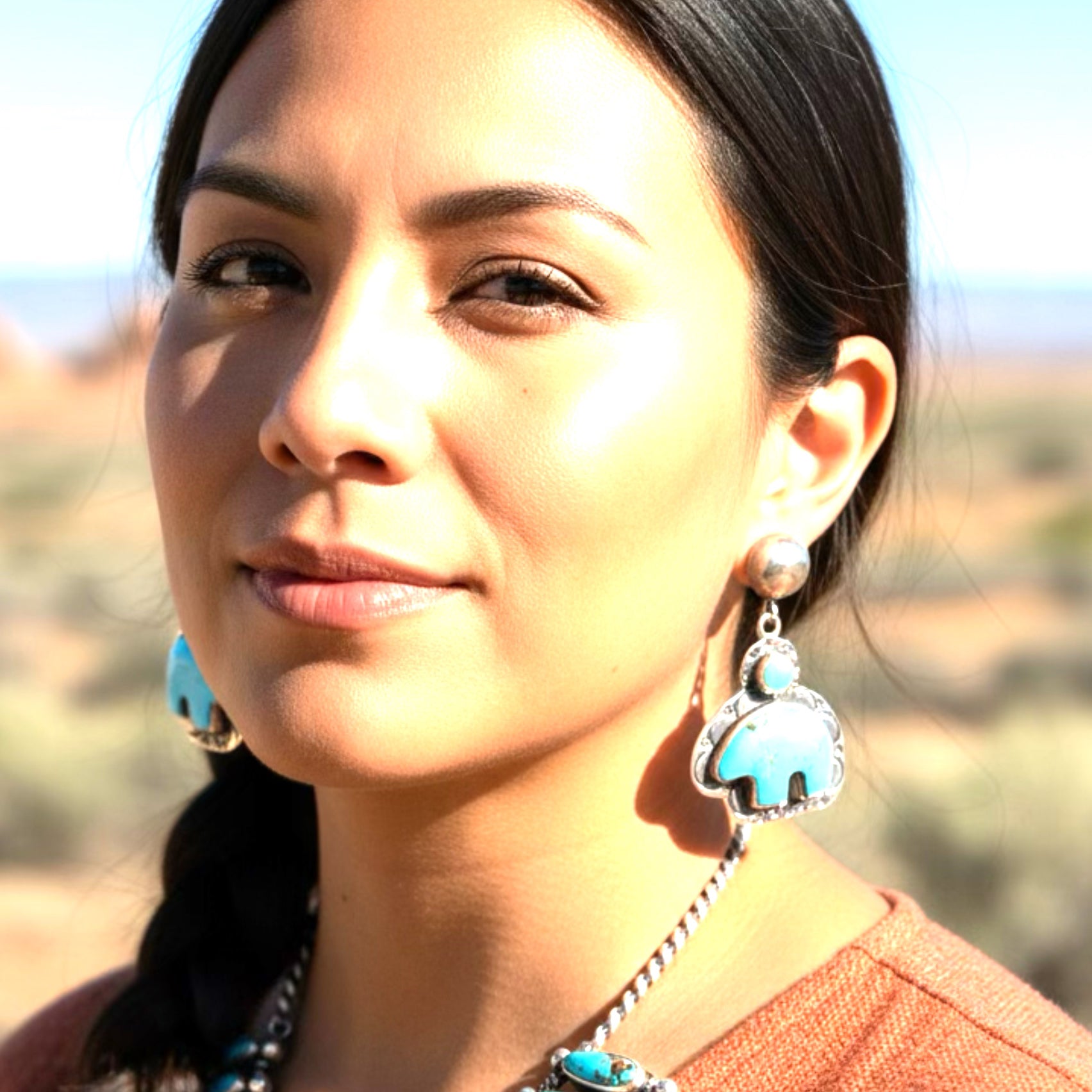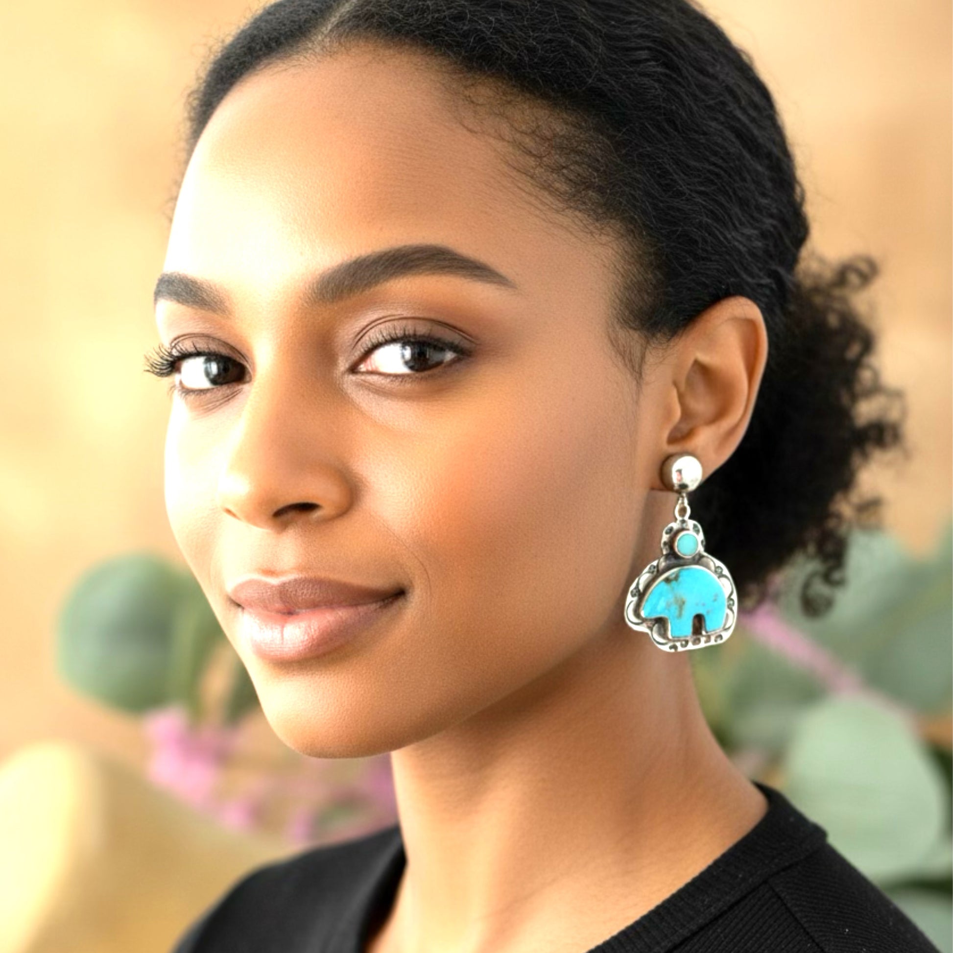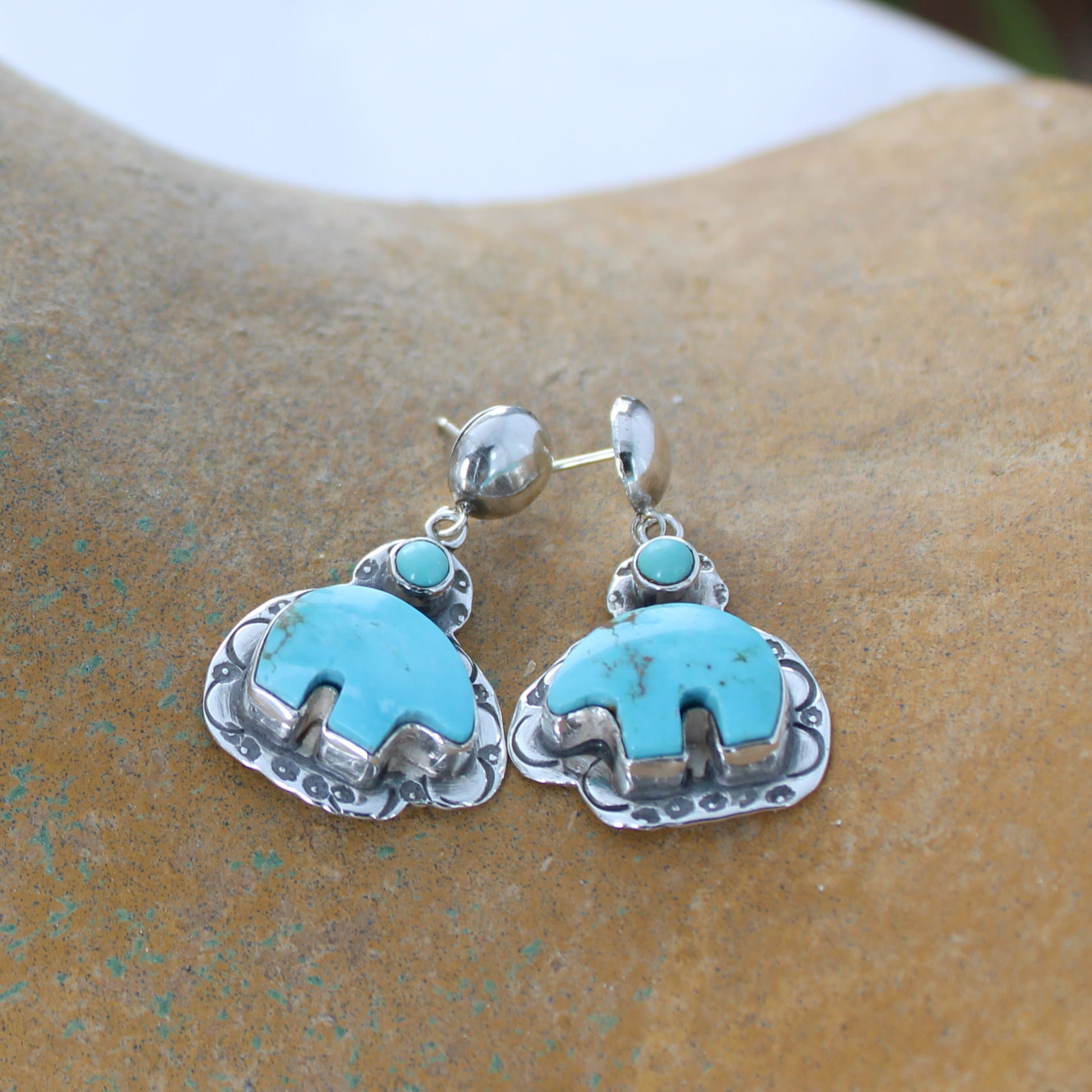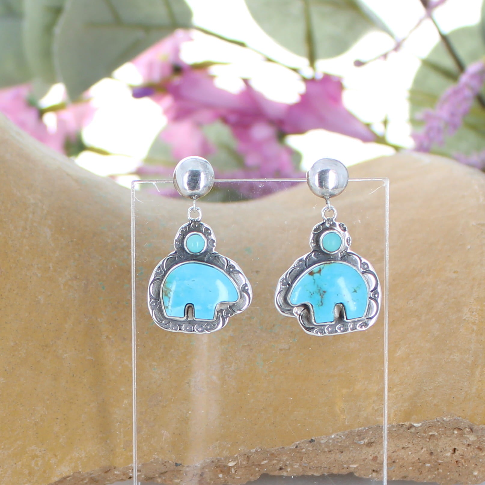 Carved Zuni Bear Kingman Turquoise Earrings Sterling Southwest