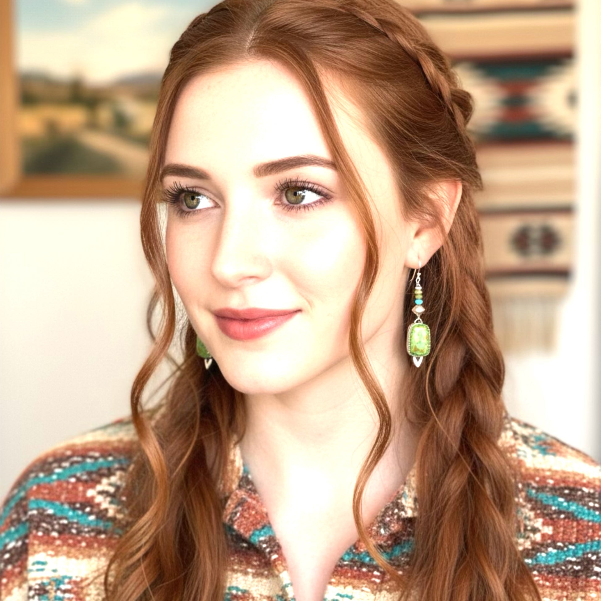 Stunning Lime Green Mexican Sonoran Gold Turquoise stones set in our .925 sterling earrings! This pretty pair of earrings hang 1.75" in length including the sterling hand shaped domed ear wires. Gorgeous handmade settings. . Designed and crafted by NewWorldGems.