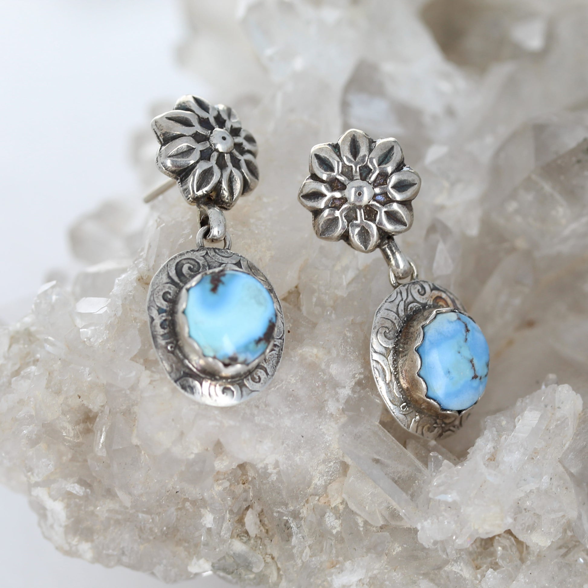 Stunning natural Kazakhstan Turquoise elegant floral earrings! We patterned the sterling with a spiral design and then handcrafted this unique pair of earrings! Suspended from hand formed floral ear wires {using a vintage mold from the 70`s}, our beautiful earrings measure 1.25" in length. A must have for any turquoise collector!