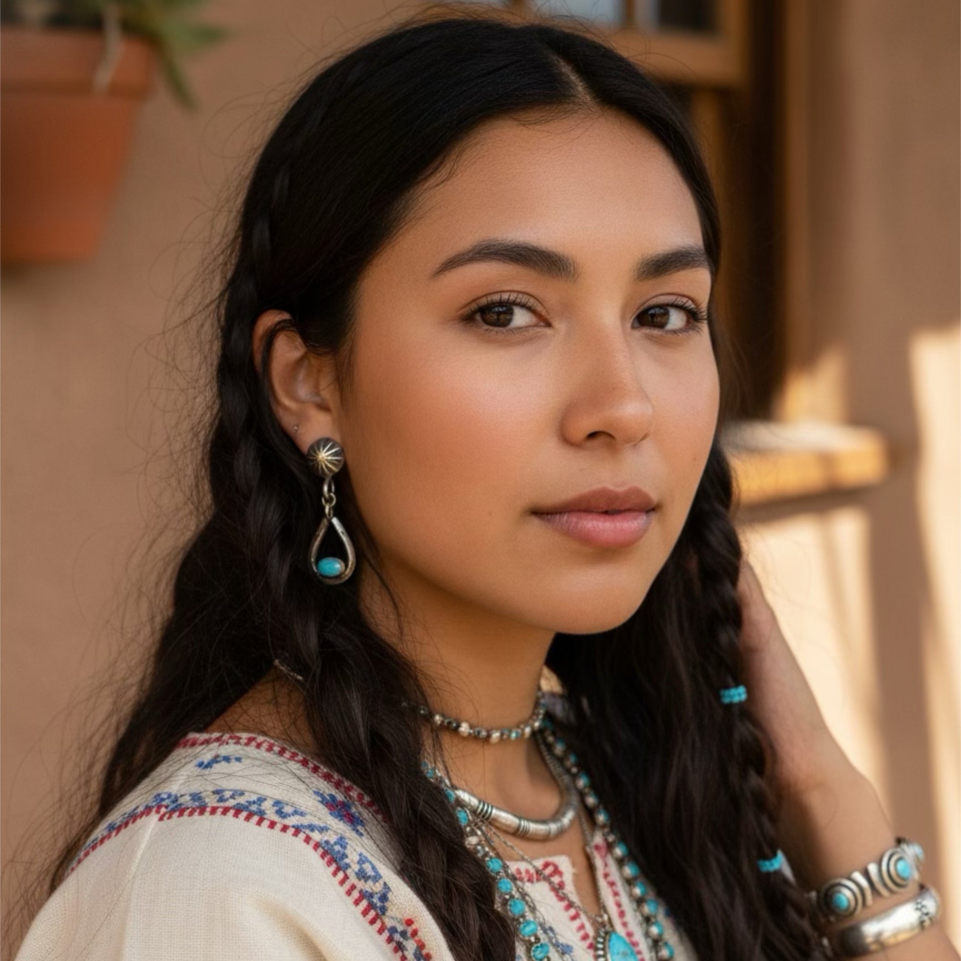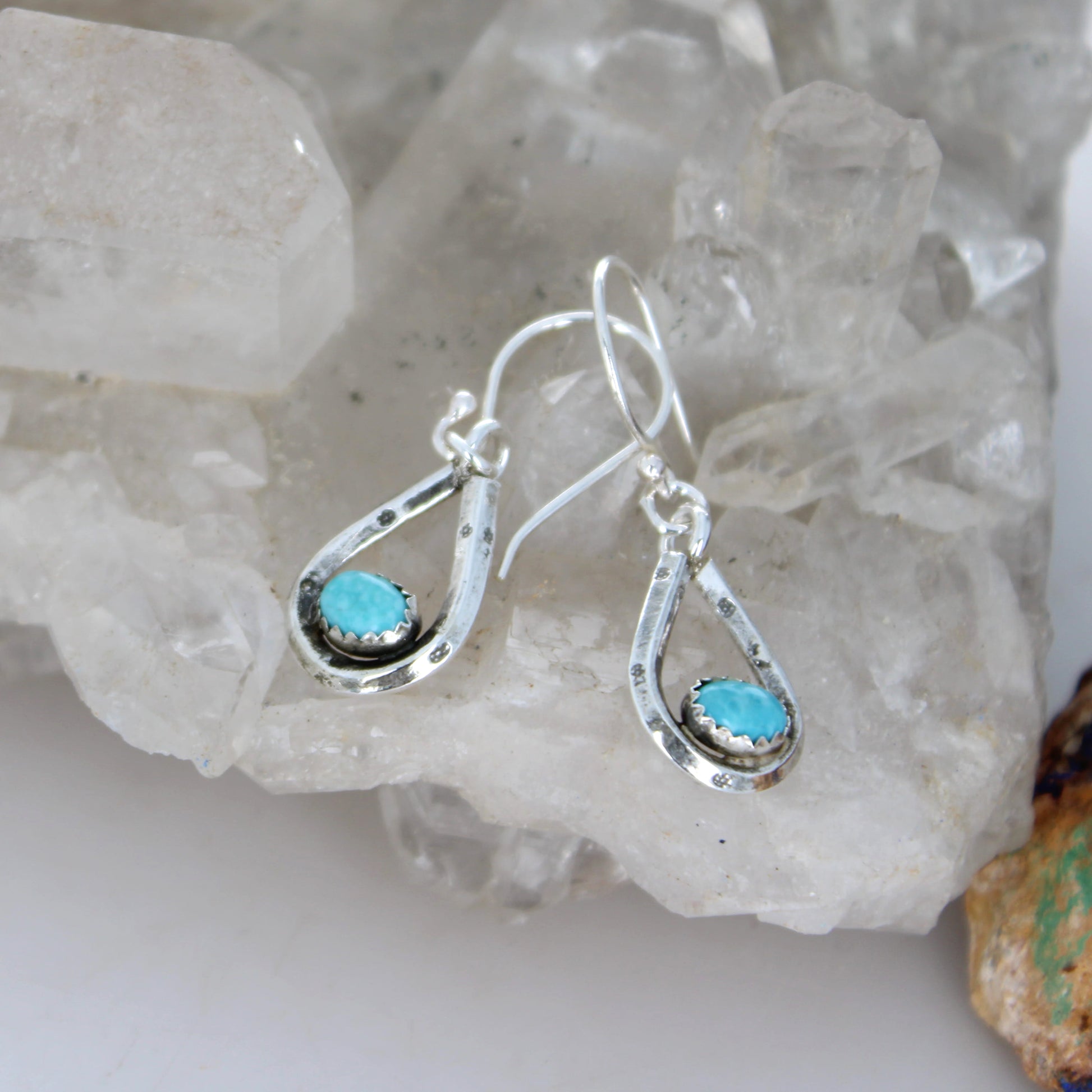 Beautiful Sky blue Kingman turquoise stones we set in our horseshoe/stirrup earrings! Measuring 1.15" in length, each suspended by hand shaped French ear wires. Handmade exclusive design by NewWorldGems.