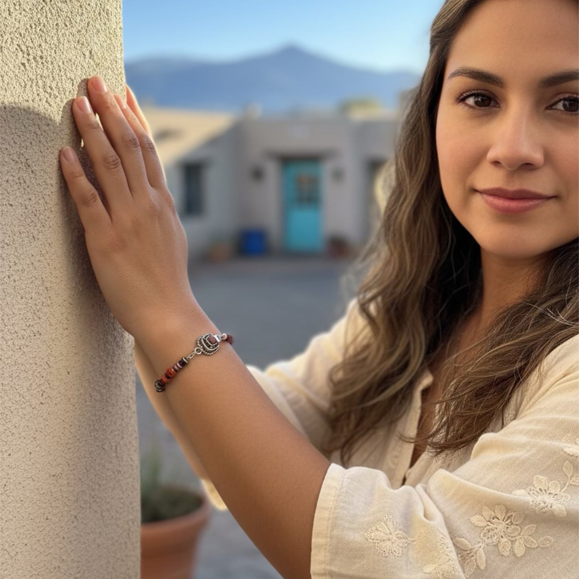 3.5 to 5mm natural Red and Purple Spiny Oyster beads are accented with Navajo Pearls and White Buffalo Turquoise beads for a unique bracelet! Strung with our own matching sterling clasp. Total finished bracelet length is 7.5". One of a kind!