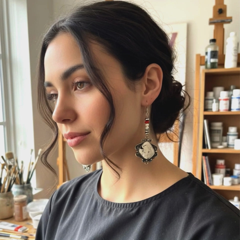 Beautiful natural and very rare white Turquoise referred to as White Buffalo Turquoise here in the Southwest because it is rarely seen, just like the treasured buffalo. Very pretty shades of cream and white marbled with lots of black spider webbing. 14x20mm stones we set in our handmade sterling silver settings. 2.75" overall size. Accented with genuine Red Italian Coral beads.