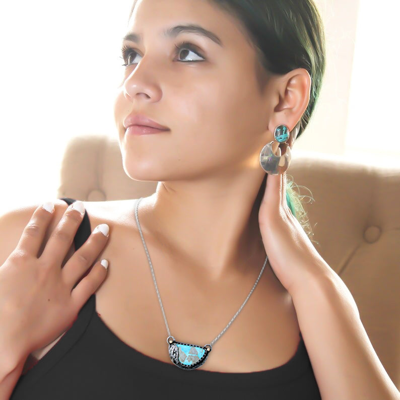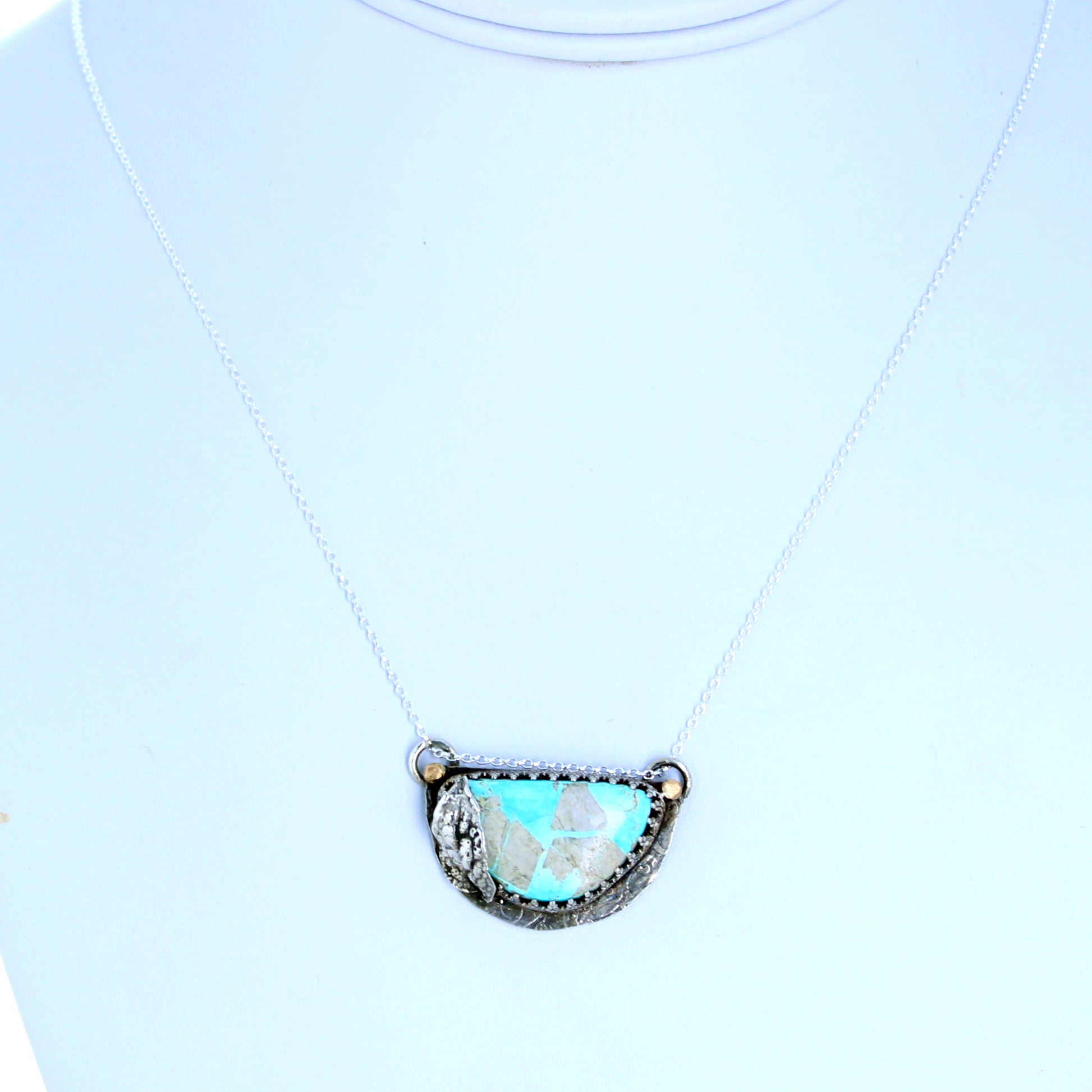 Royston Turquoise Moon Pendant Decorative 18K Gold and Sterling Necklace
