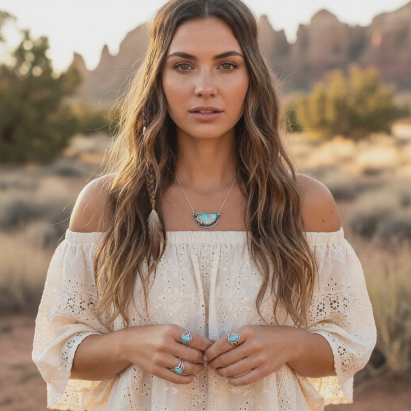 Royston Turquoise Moon Pendant Decorative 18K Gold and Sterling Necklace