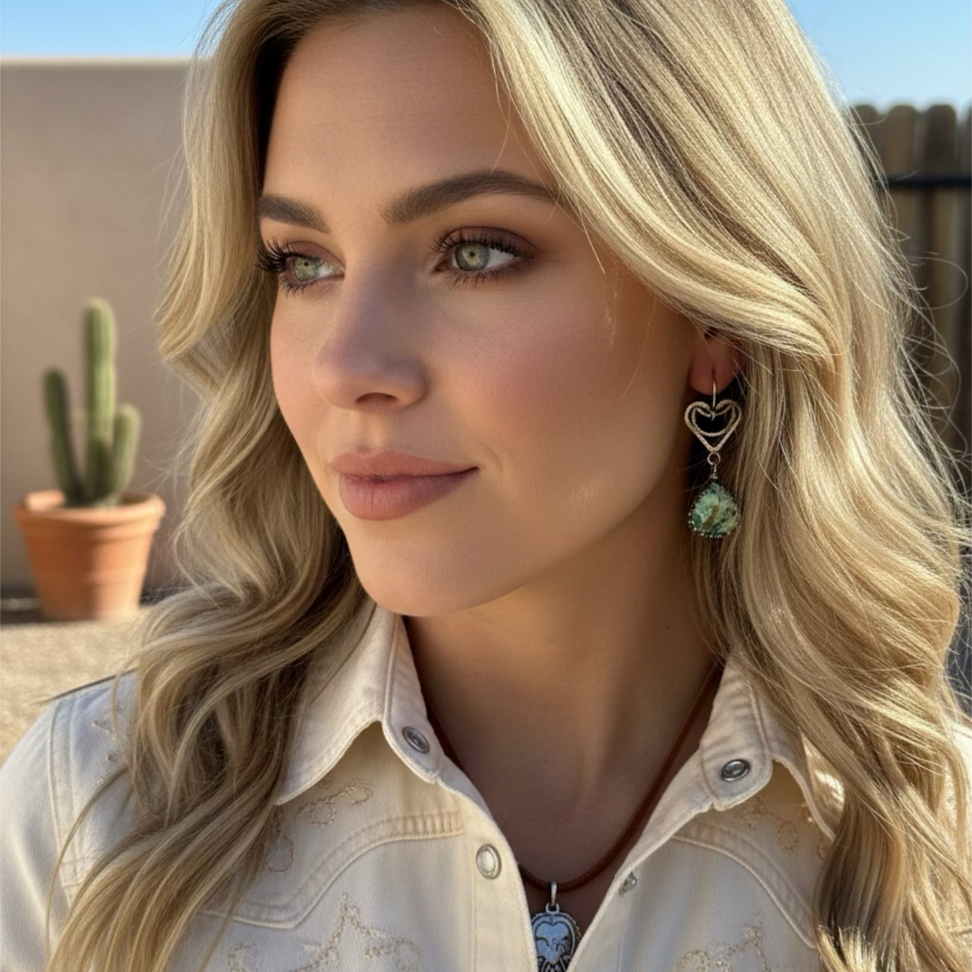 Exquisite Tibetan turquoise set in our special heart and North Star sterling silver earrings! A very unique gift for yourself or someone special! Extremely rare turquoise you`ll be honored to wear from this magical culture. 1.7" overall length.