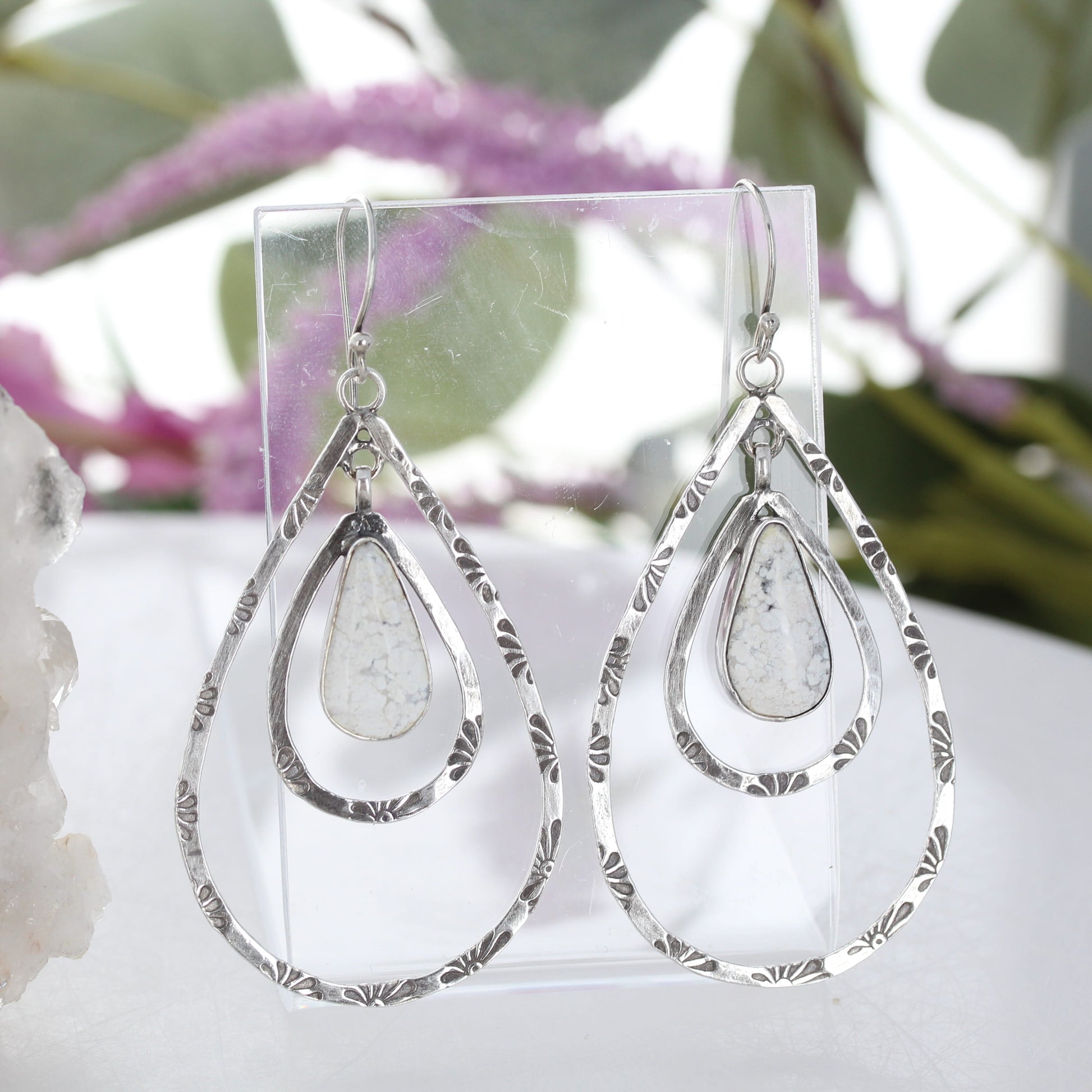 White Buffalo Turquoise Earrings Double Hoops Oxidized